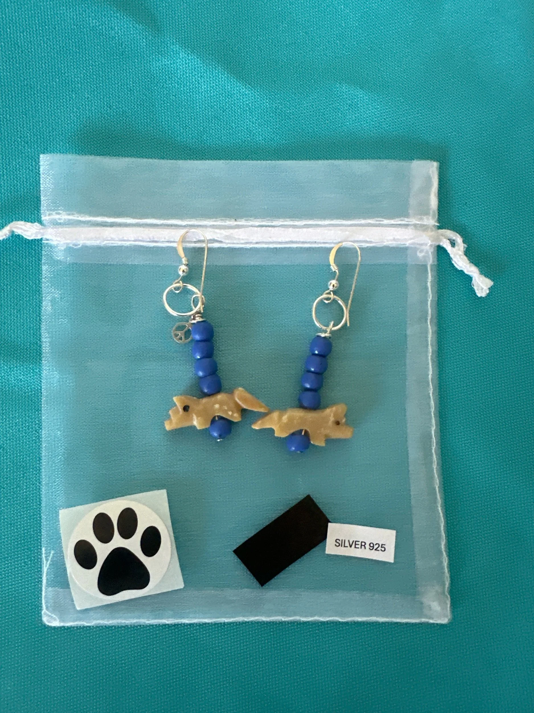 Vintage Wolf fetish animals, carved from Jasper, ride along Old Turkana blue trade beads from Kenya.