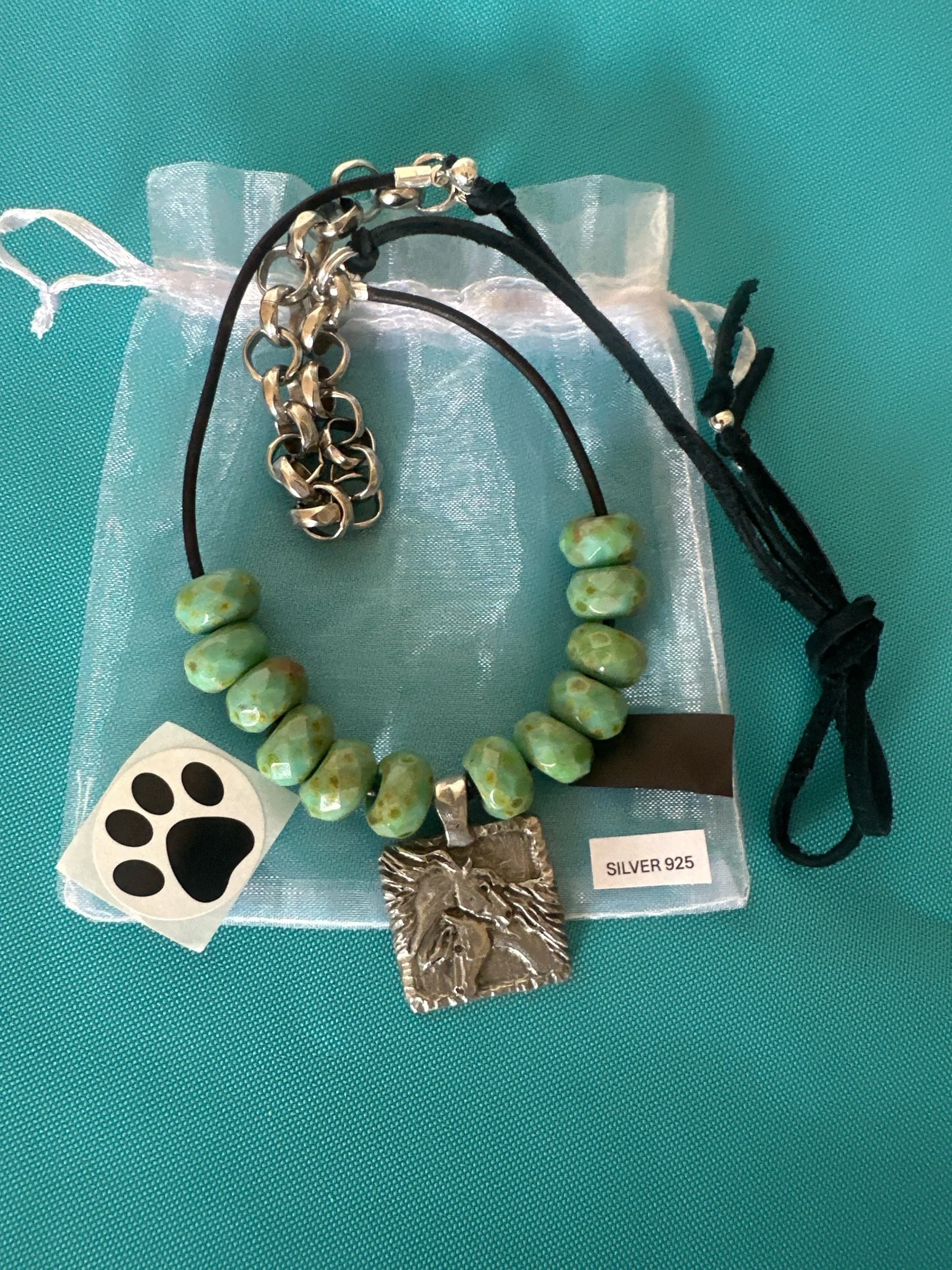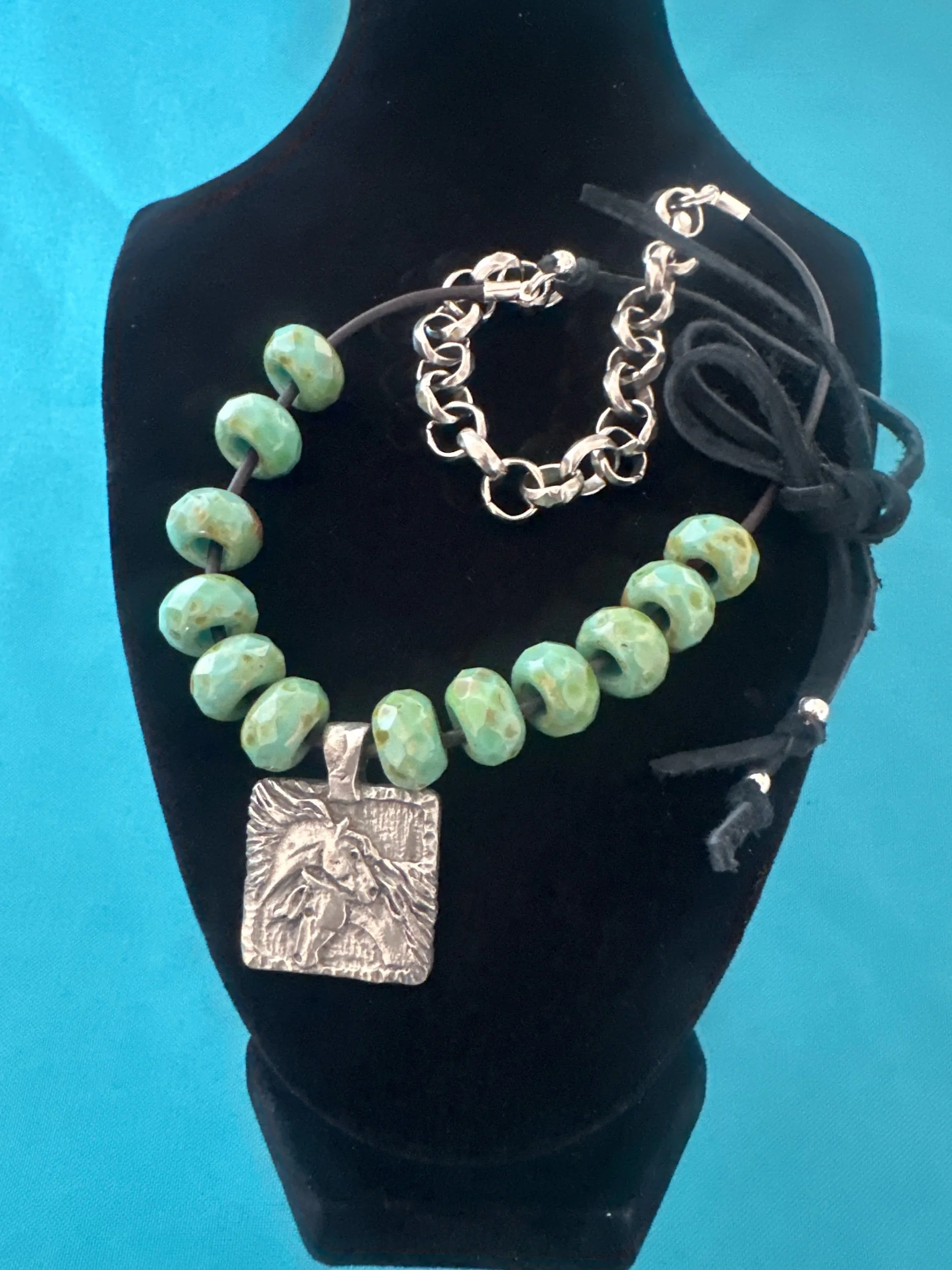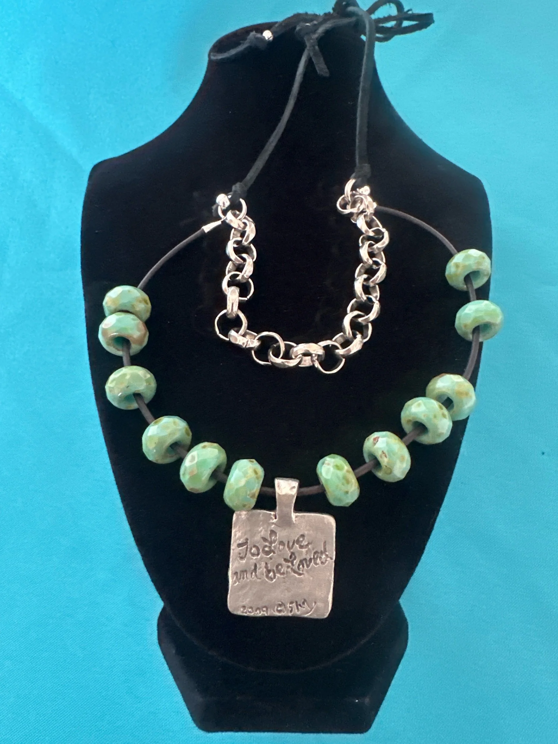 An etched pewter pendant, with a Mare and Foal on one side, and “To Love and be Loved” on the other.