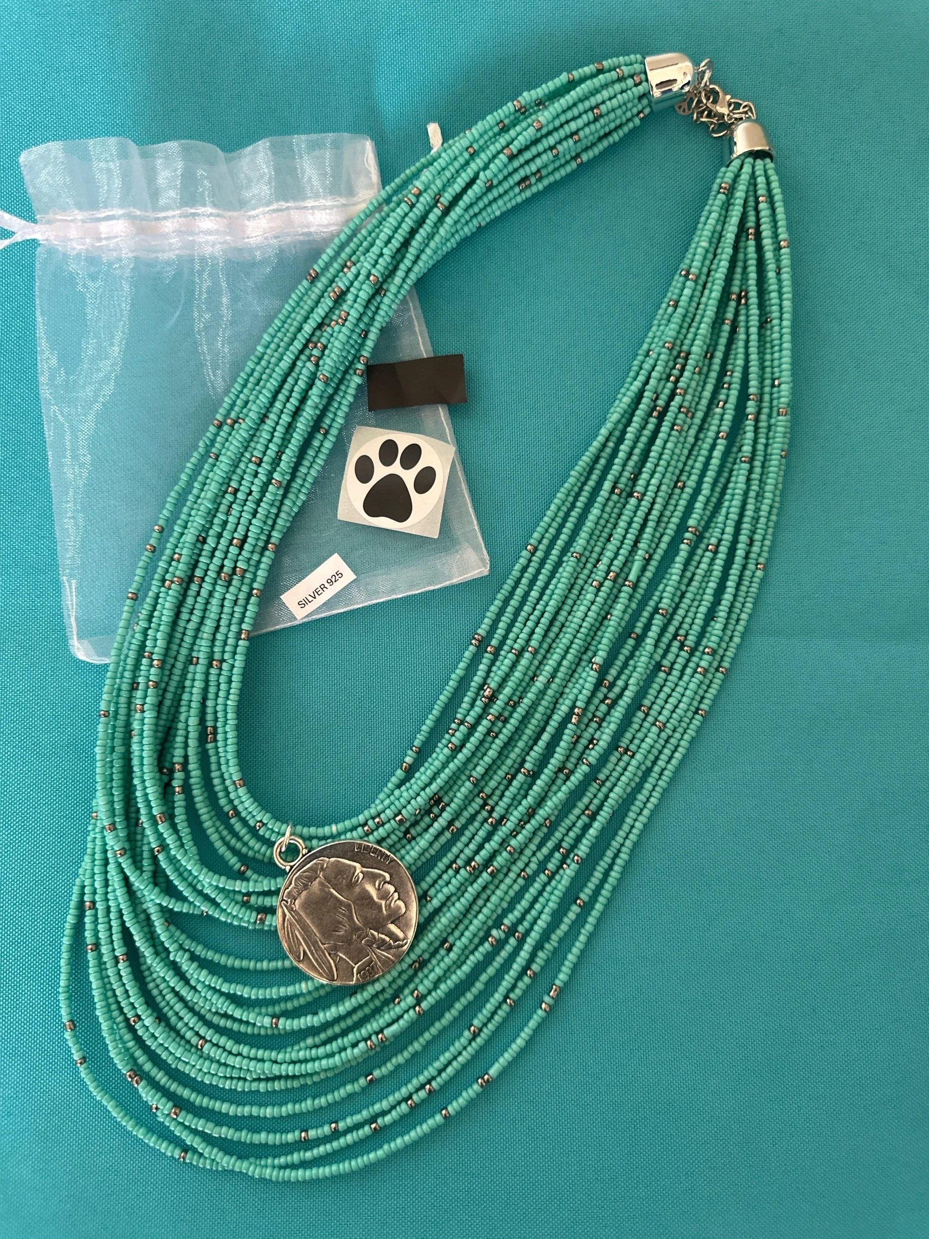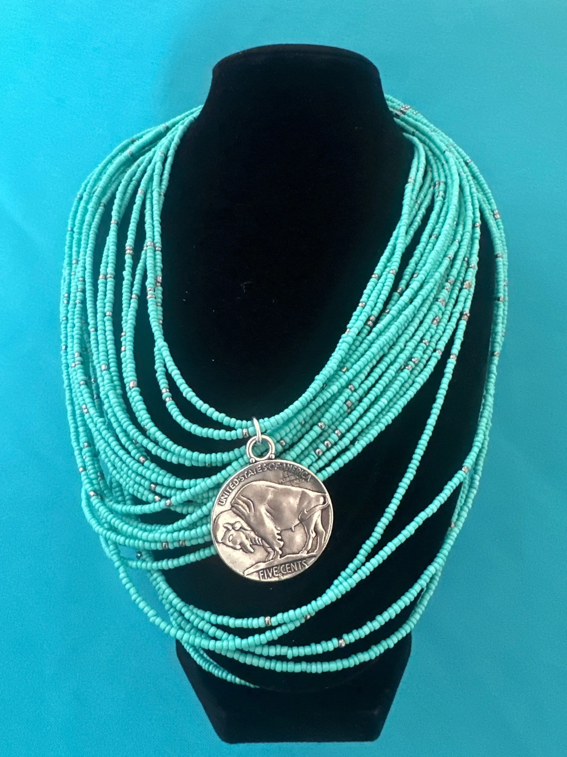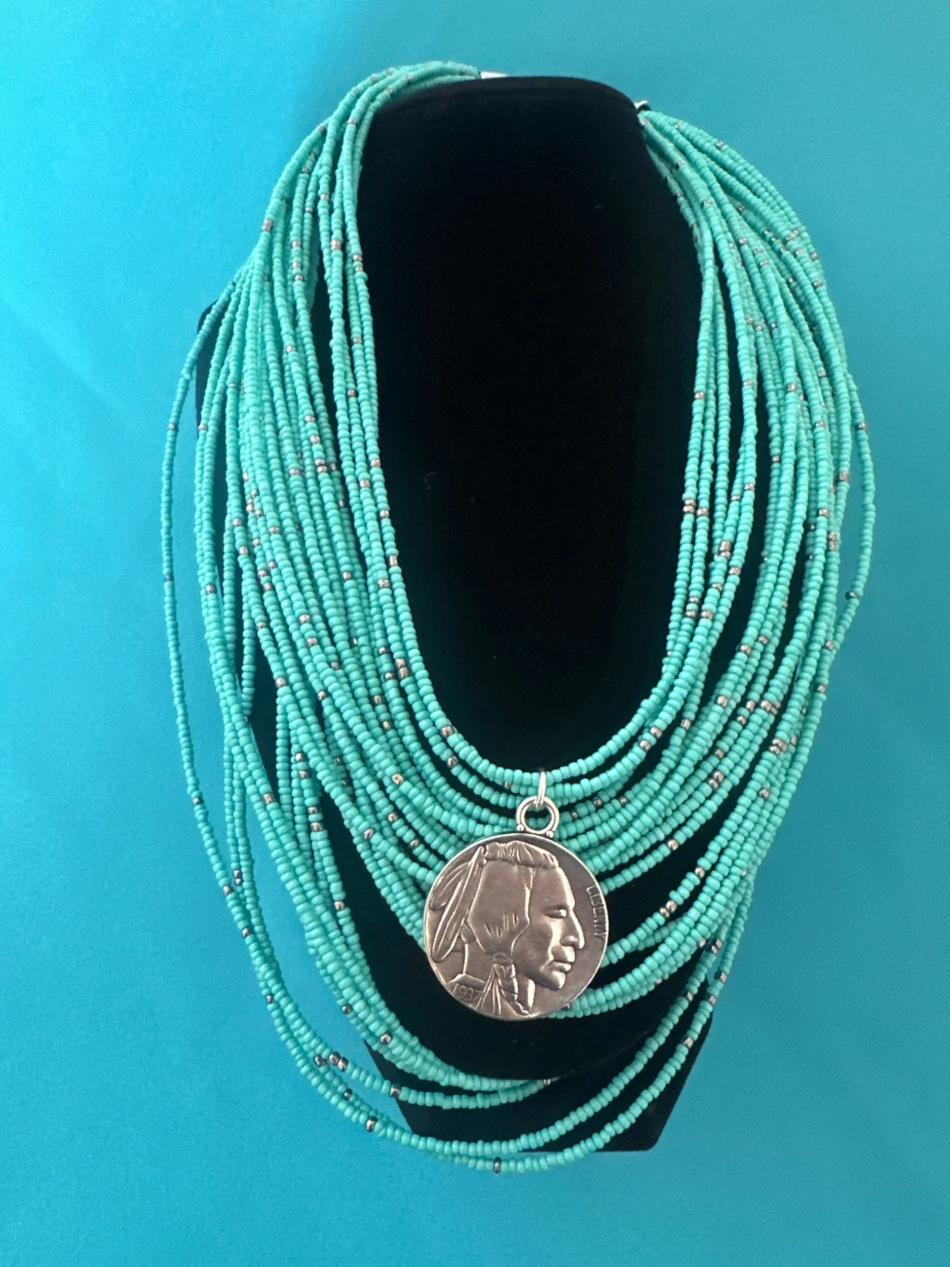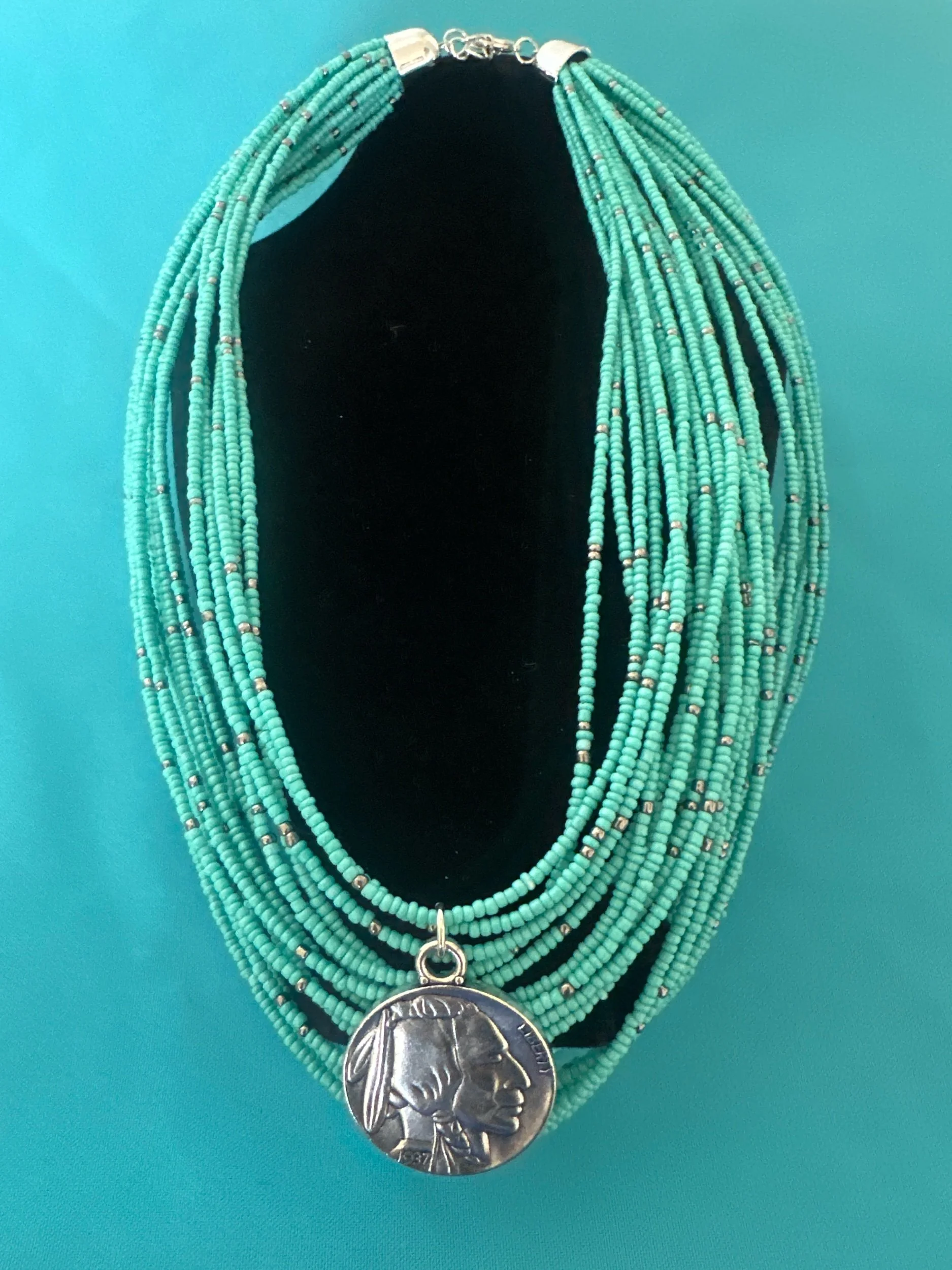 Strung on a vintage, heavy turquoise colored and silver tone, seed bead necklace.