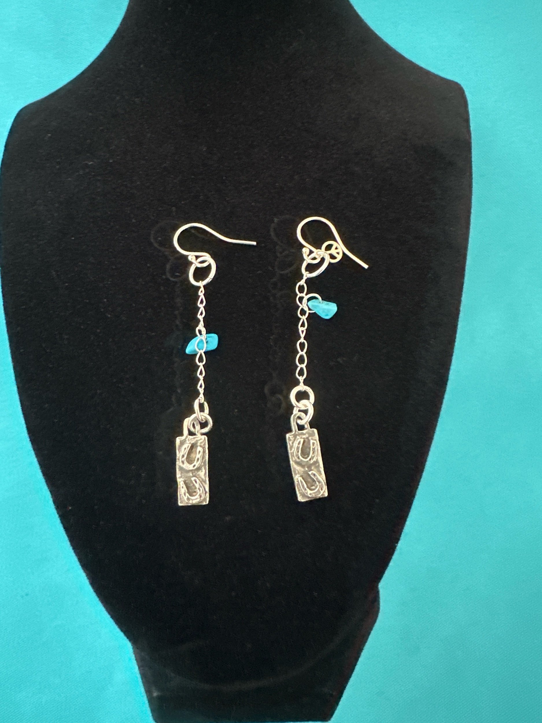 Small hanging horseshoes (pewter) dangle from Sterling silver chains.