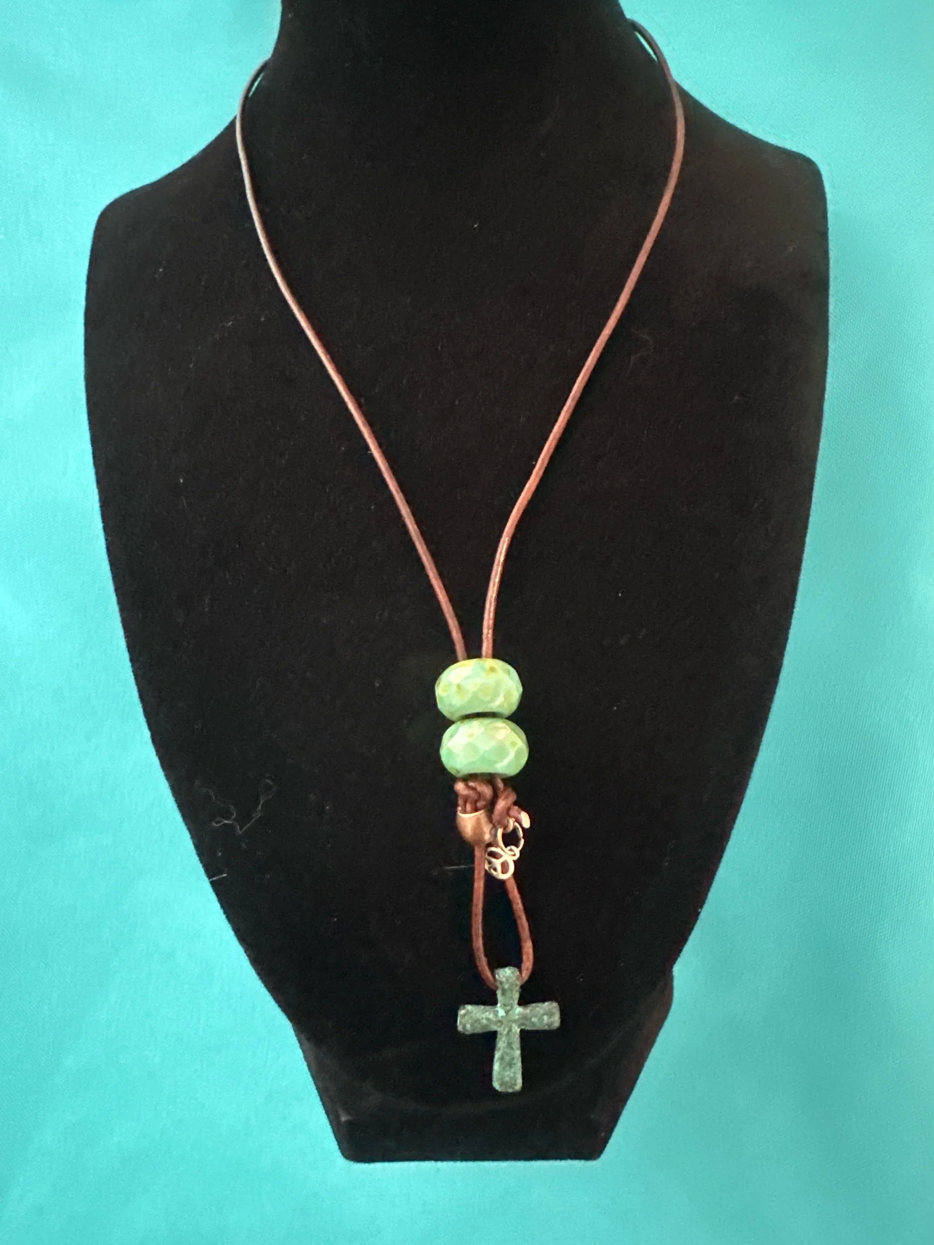 Adorable turquoise patina cross (copper plated) hangs from a distressed brown leather cord.