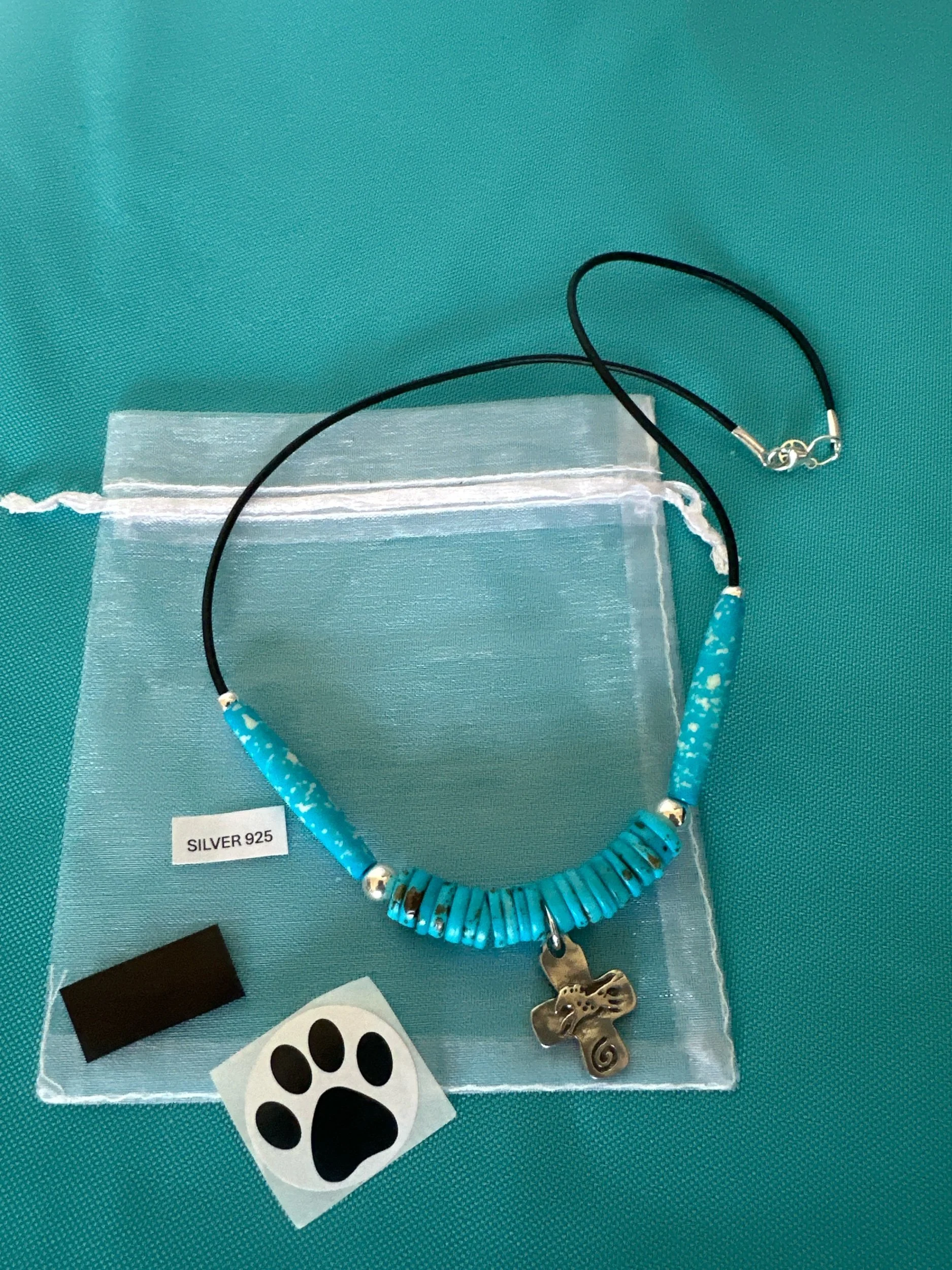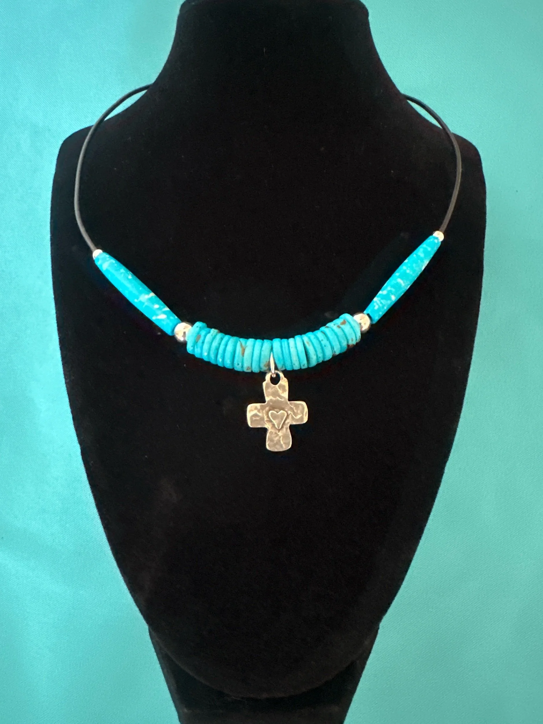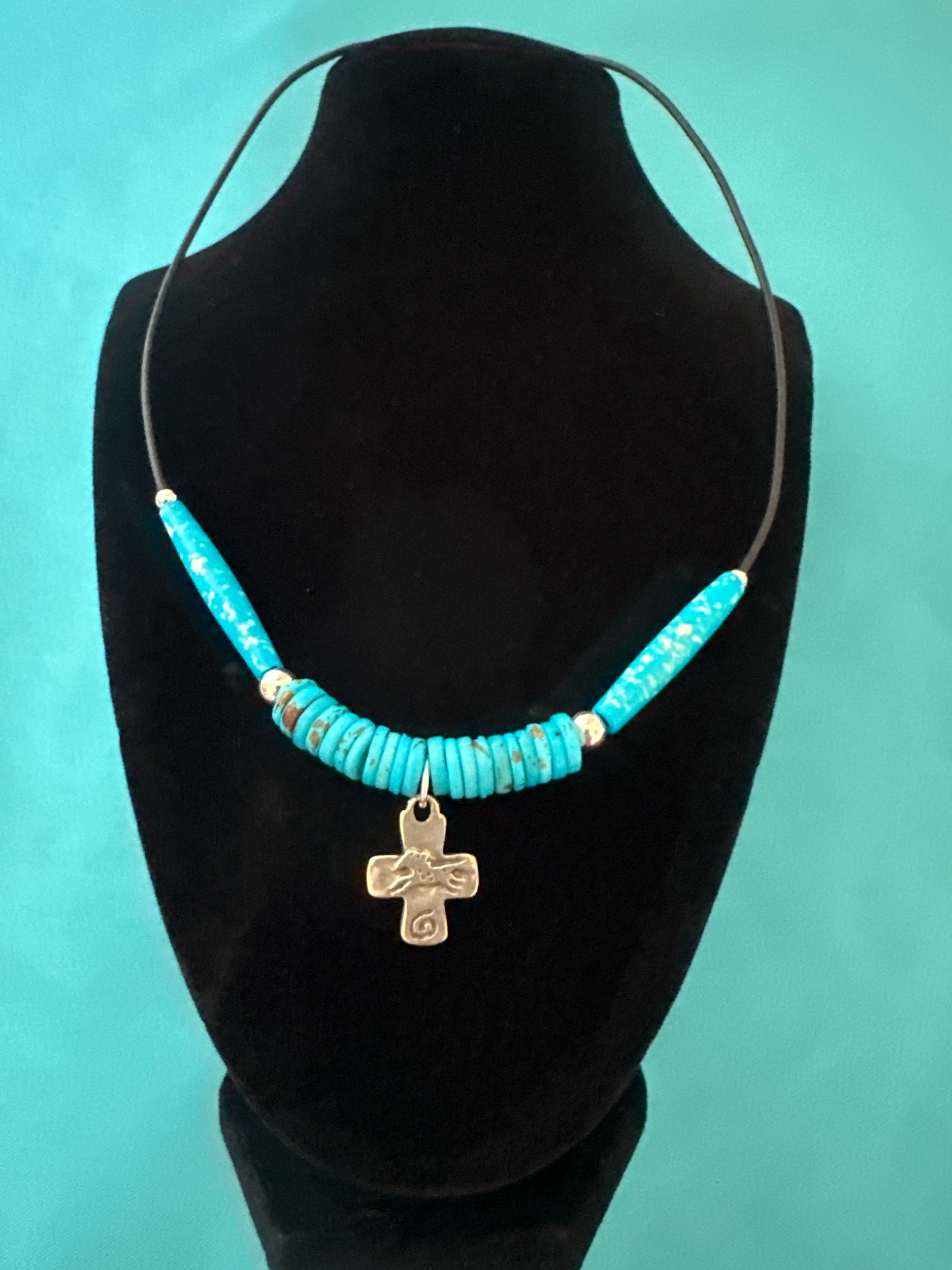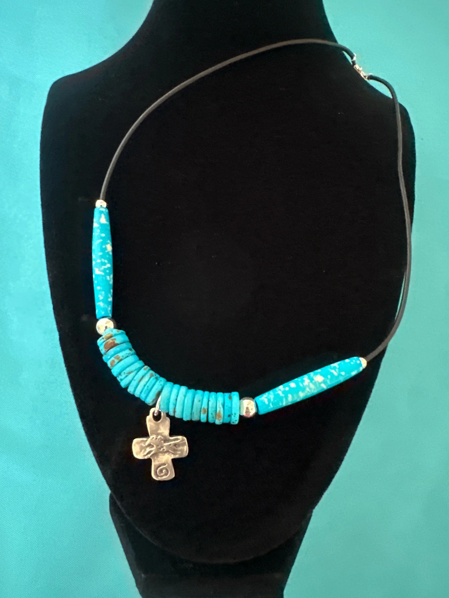 Turquoise Bone Hairpipe Beads (buffalo) and vintage blue Heishi beads (possibly Howlite) are strung on a black leather cord.